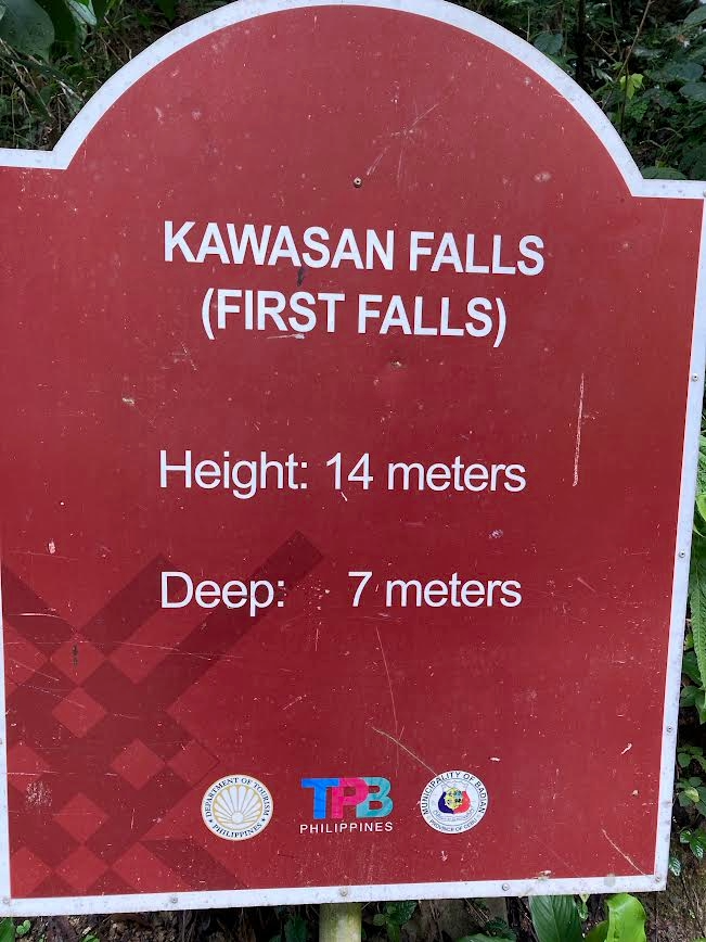 遠かった、思ったより遠かった。バイクの駐車場から30分ぐらいは歩いただろう。幸い右には生い茂る植物、左には青い川に挟まれた山道であったため、マイナスイオンのシャワーに癒されつつハイキングを楽しむことができたが、意外と遠いことは明記しておく(笑)。もうすぐ滝であろうことをうかがわせる看板発見。深さ7メートル!意外と深いな。『First Fall(第一の滝)』とあるように、カワサンフォールはいくつかの滝にわかれており、キャニオニングツアーに参加すると、第2第3(?)まで行くことができるらしい。