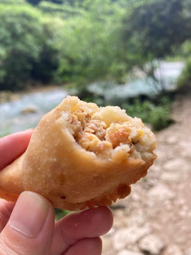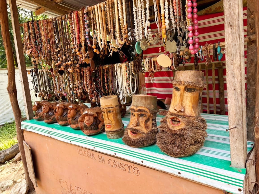川では地元の子供たちが水浴びをしていた。なるほど、彼らにとっては生活の一部だよね。子供に手を振り、ハイキングさながらに歩いていると、途中に入場料を支払う小屋があり、更に歩を進めると、ところどころにお菓子やお土産を売る屋台がある。思わず目を奪われる個性的なお土産(笑)。さらに、ここでまさかのエンパナーダを発見!つい買ってしまった。(【セブの路上お菓子Part3】参照)小腹を幸せで満たしつつ歩いていると、スタッフに声をかけられ、そこで環境保護についての説明を聞く。さらに歩を進めるとようやく滝がその姿を現すのである。